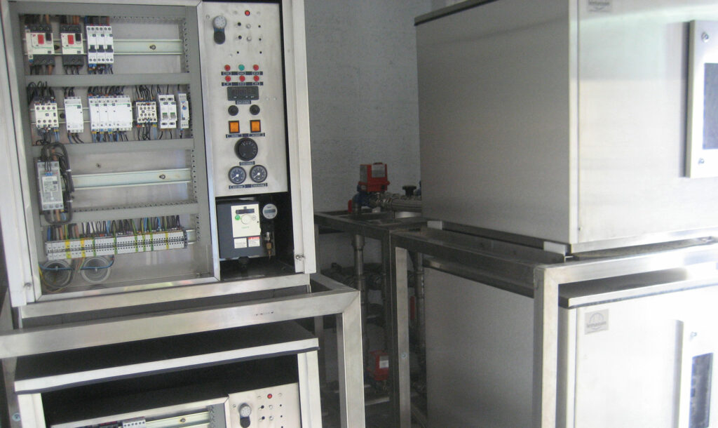 Quatre pompes à chaleur modèle T130 installées en formant skid chauffent l’eau d’un ballon tampon de 1000 litres.